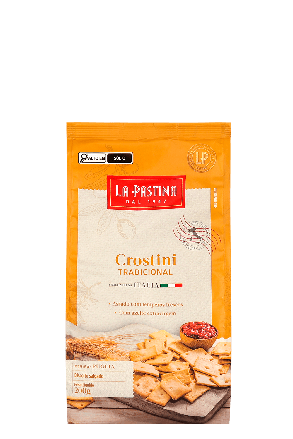 Remete à tradição do pão italiano cortado bem fininho e assado lentamente até dourar e ficar perfeitamente crocante. A versão mais tradicional é elaborada à base de farinha de trigo, azeite de oliva extravirgem e sal. De sabor mais neutro, pode ser servido como snack, acompanhando caldos e sopas ou como aperitivo, junto de antepastos, bruschettas, patês e queijos.