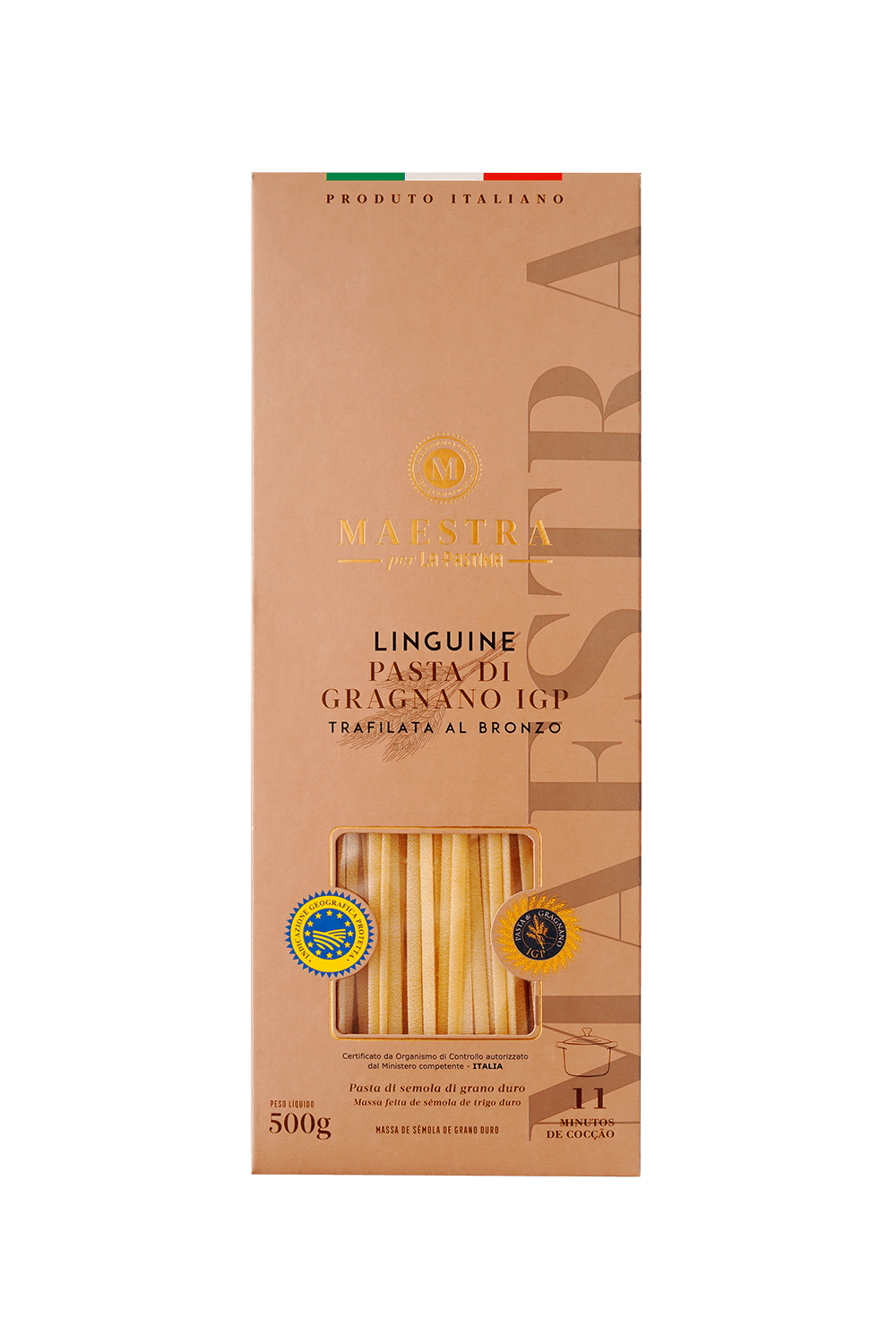 Produzida na histórica cidade de Gragnano, reconhecida como a “Città della Pasta” e berço da tradição italiana secular, a Linguine di Gragnano representa o ápice da excelência em massas. Confeccionada exclusivamente com sêmola de trigo duro 100% italiano e água mineral pura da região, esta massa é certificada com o selo IGP, que assegura o uso de métodos tradicionais e ingredientes locais de altíssima qualidade.
