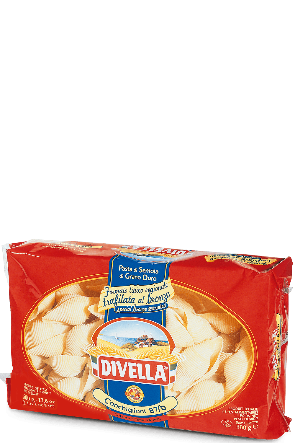 O conchiglioni tem um formato semelhante às conchas do mar. É um formato perfeito para ser recheado com carnes, legumes, queijos e embutidos. Produzido em moldes de bronze - "trafilata al bronzo" -, que deixam a massa mais áspera e permitem mais absorção dos molhos. As massas Divella são feitas exclusivamente de grano duro 100% italiano, que trazem derivados do trigo com mais proteínas.