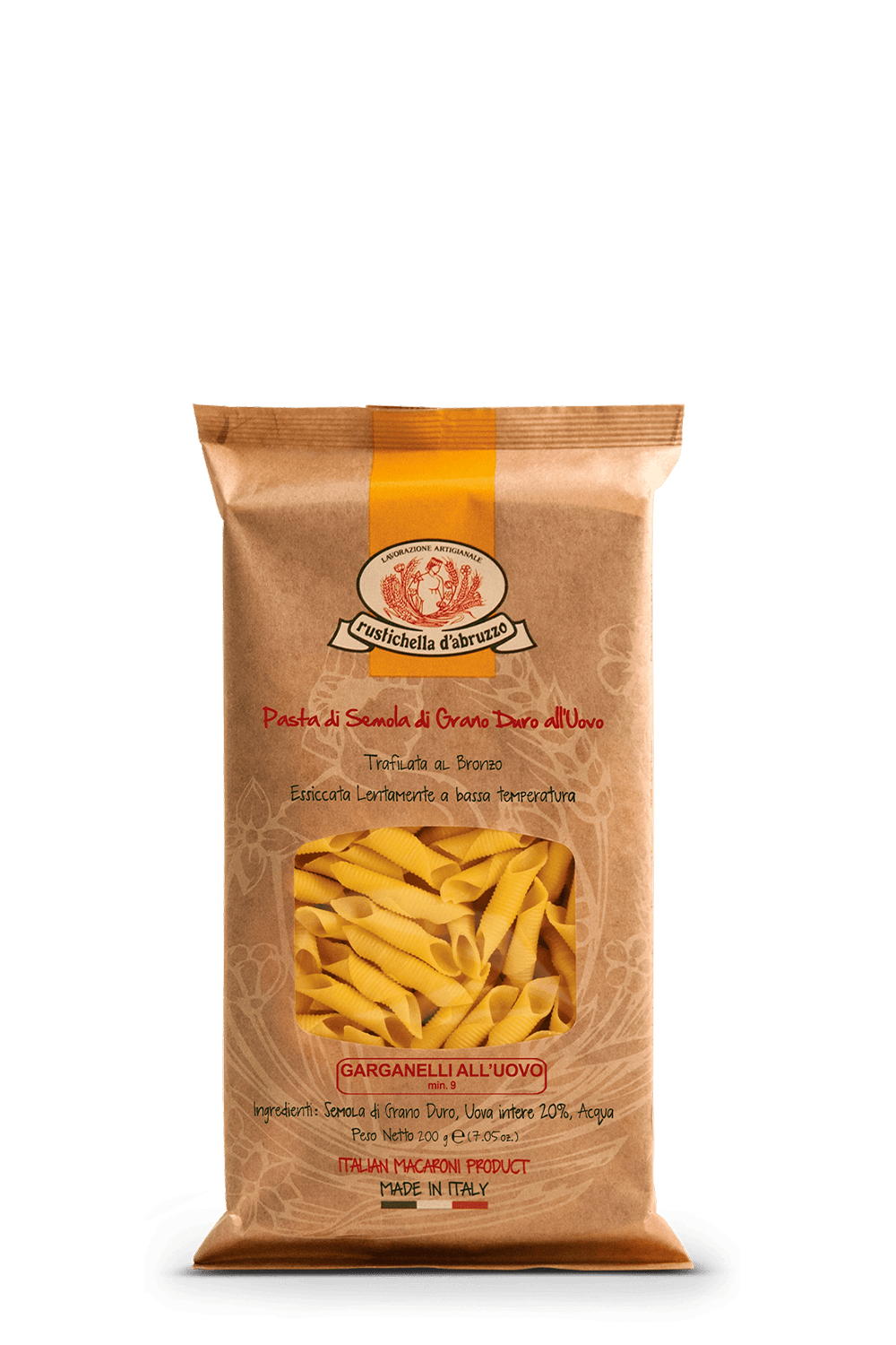 O garganelli é um corte de massa curta em formato tubular, muito semelhante ao penne. Ideal para servir com molhos mais rústicos. Produzido artesanalmente com grano duro 100% italiano de alta qualidade, que traz derivados do trigo com mais proteínas. A linha com ovos da Rustichella tem cocção mais rápida e uma textura mais leve e delicada, entregando uma massa com sabor inigualável que dissolve na boca. Feita em moldes de bronze - "trafilata al bronzo" -, que deixam a massa mais áspera e permitem mais absorção dos molhos. Além disso, tem secagem mais lenta em temperaturas mais baixas, preservando o sabor e o aroma do trigo.