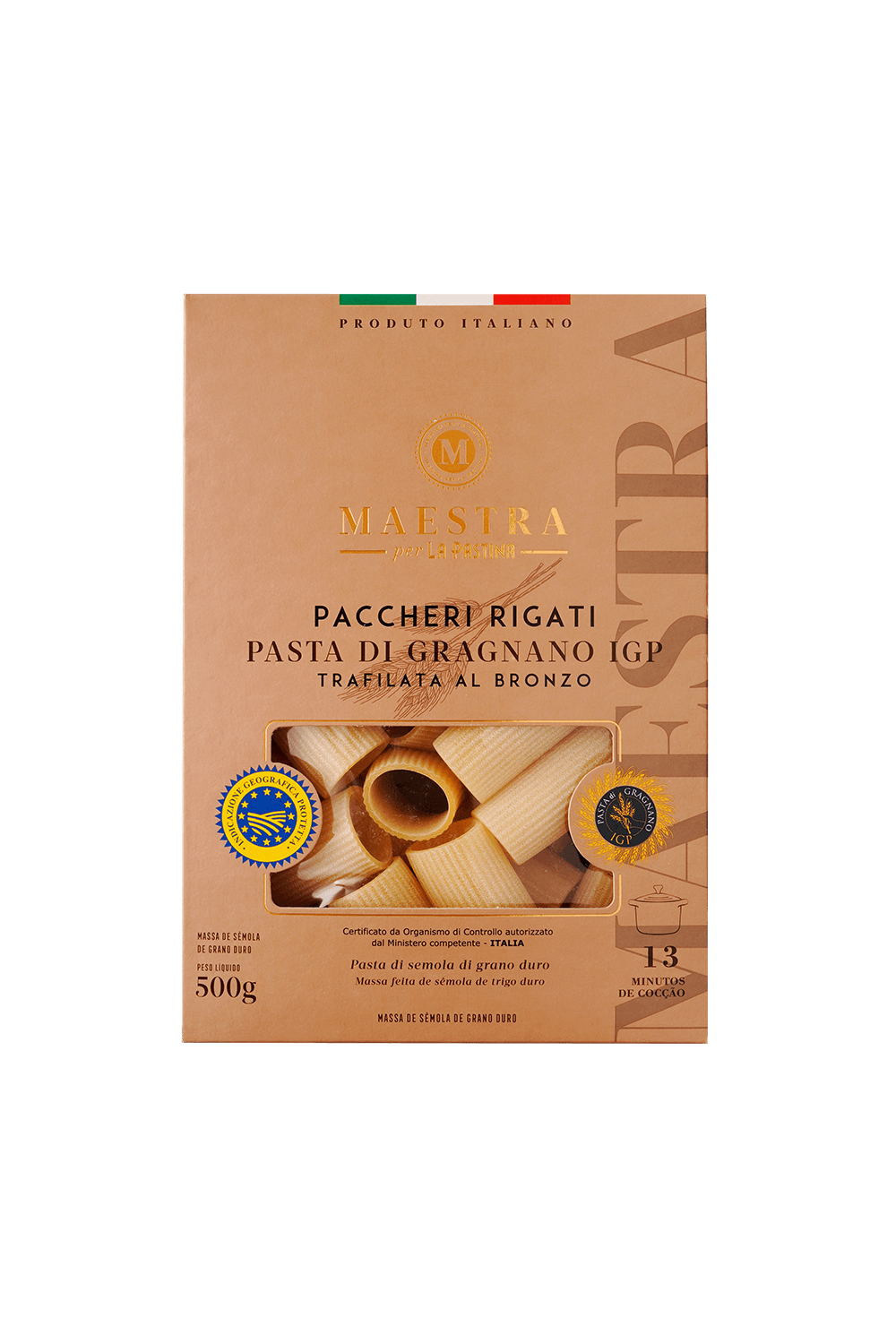Produzida na histórica cidade de Gragnano, reconhecida como a “Città della Pasta” e berço da tradição italiana secular, a Paccheri Rigati di Gragnano representa o ápice da excelência em massas. Confeccionada exclusivamente com sêmola de trigo duro 100% italiano e água mineral pura da região, esta massa é certificada com o selo IGP, que assegura o uso de métodos tradicionais e ingredientes locais de altíssima qualidade.