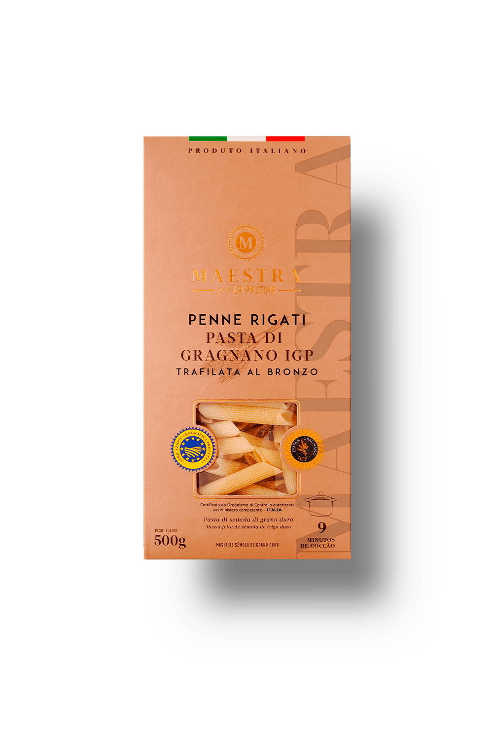 Produzida na histórica cidade de Gragnano, reconhecida como a “Città della Pasta” e berço da tradição italiana secular, a Penne Rigati di Gragnano representa o ápice da excelência em massas. Confeccionada exclusivamente com sêmola de trigo duro 100% italiano e água mineral pura da região, esta massa é certificada com o selo IGP, que assegura o uso de métodos tradicionais e ingredientes locais de altíssima qualidade.