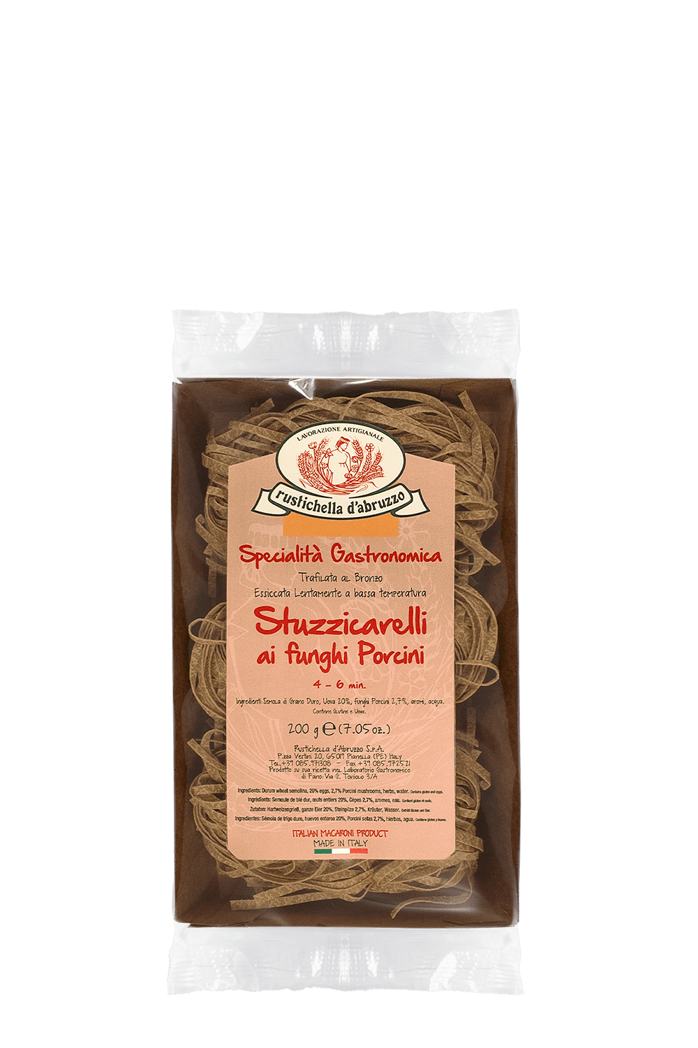 O stuzzicarelli saborizado com cogumelos porcini é uma massa longa promovendo um sabor diferenciado. Produzido artesanalmente com grano duro 100% italiano de alta qualidade, que traz derivados do trigo com mais proteínas. A linha com ovos da Rustichella tem cocção mais rápida e uma textura mais leve e delicada, entregando uma massa com sabor inigualável que dissolve na boca. Feita em moldes de bronze - "trafilata al bronzo" -, que deixam a massa mais áspera e permitem mais absorção dos molhos. Além disso, tem secagem mais lenta em temperaturas mais baixas, preservando o sabor e o aroma do trigo.